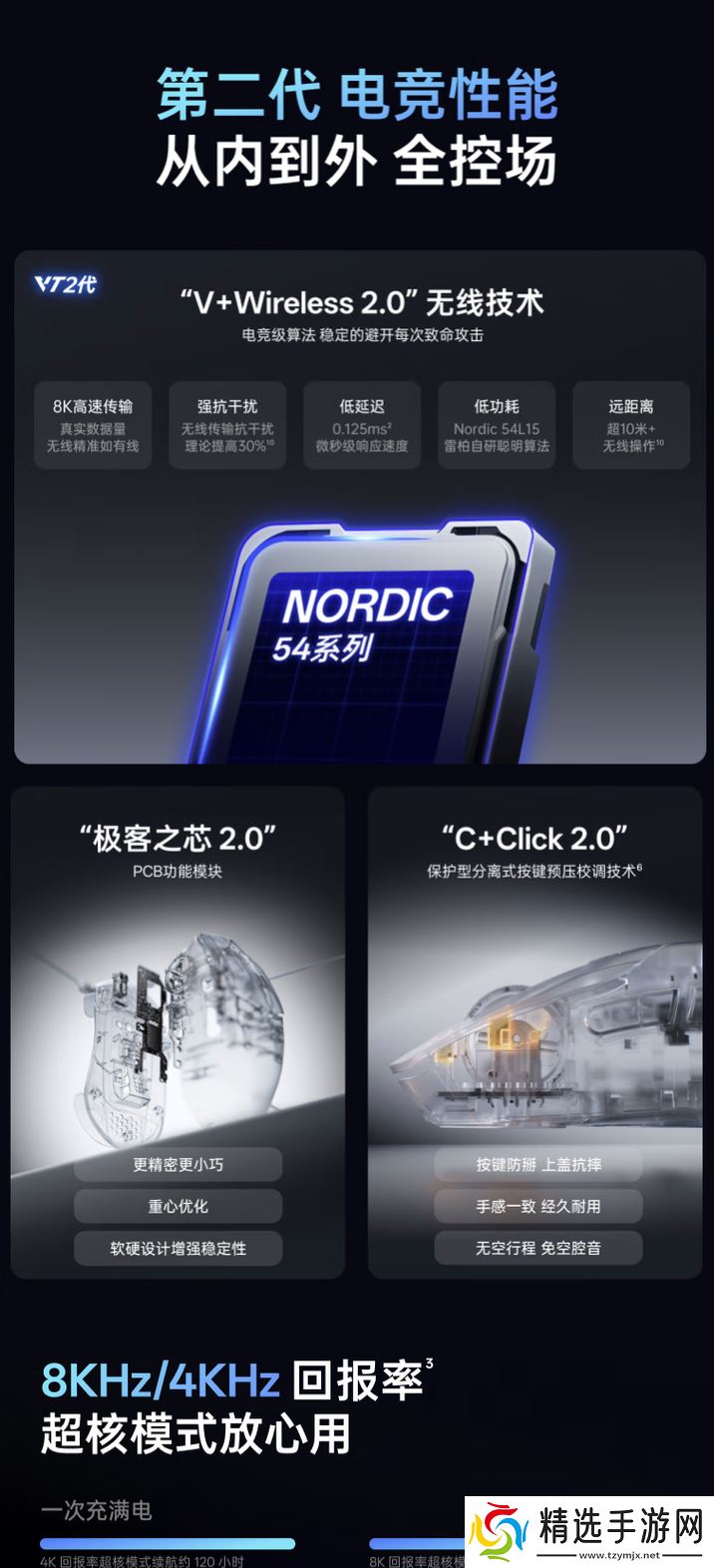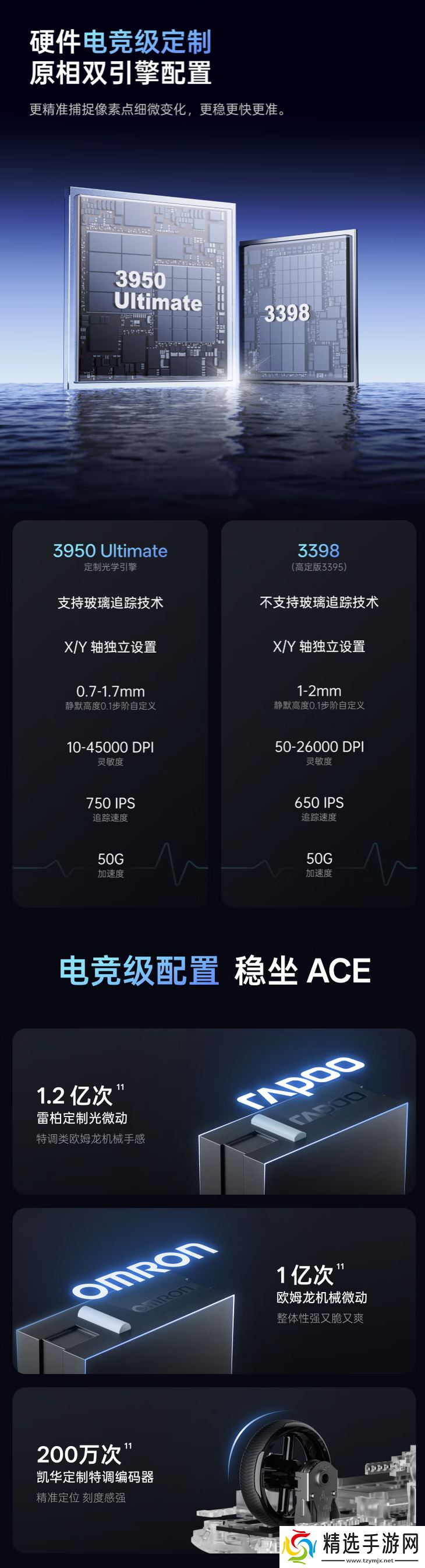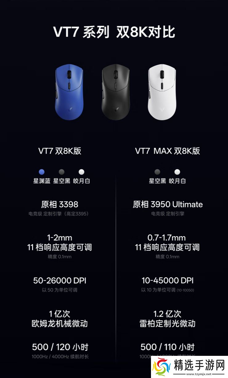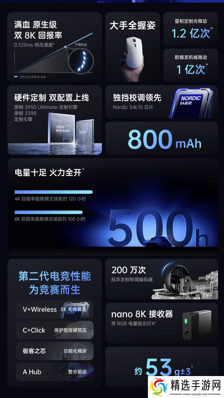系列鼠标支持有线无线双8KHz回报率,内置 800mAh电池(续航至高 500 小时),搭载 Nordic 54L15主控,其中标准版采用原相3398传感器 + 欧姆龙机械微动,MAX版采用 3950Ultimate传感器 + 雷柏定制光微动。