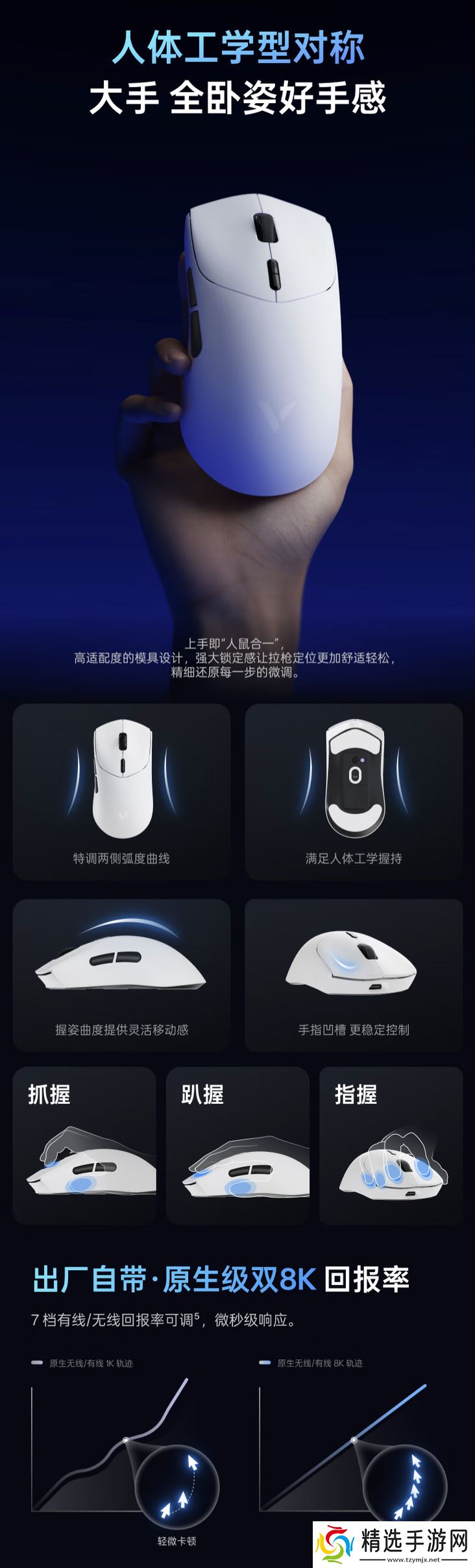 系列鼠标采用了人体工学对称式外观设计,适用于大手手型,适合抓握 / 趴卧 / 指卧使用。