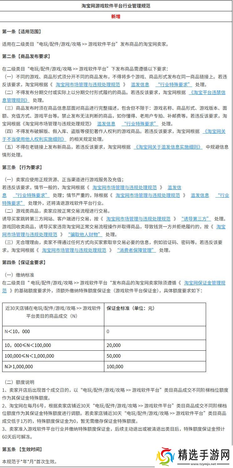 本站 4 月 25 日消息,淘宝网周三发布了一则公告,针对《淘宝网游戏软件平台行业管理规范》中的商品发布要求、行为要求等方面做出了详细规定。本站汇总如下: