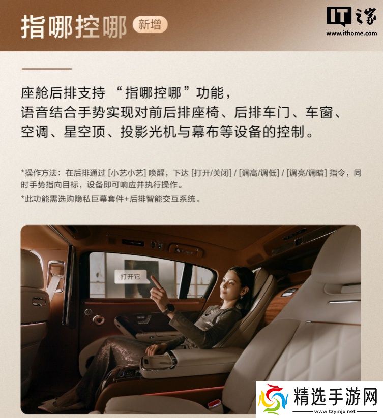 据本站此前报道,鸿蒙智行“时代旗舰”尊界 S800 汽车已开启 8 月 OTA 体验升级,其中便提到了座舱后排支持“指哪控哪”功能。根据描述,该功能支持语音结合手势实现对前后排座椅、后排车门、车窗、空调、星空顶、投影光机与幕布等设备的控制。