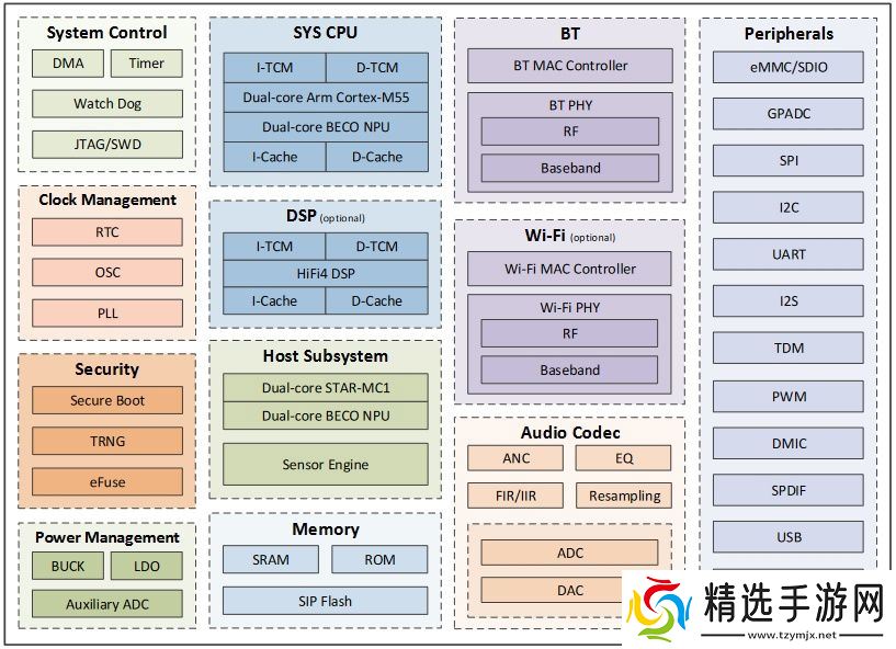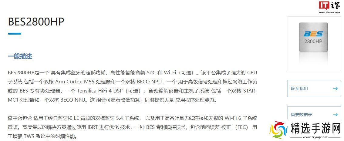 本站查询恒玄科技官网获悉,BES2800HP 是一个具有集成蓝牙的超低功耗、高性能智能音频 SoC 和 Wi-Fi(可选)。该平台集成了 CPU 子系统包括一个双核 Arm Cortex-M55 处理器和一个双核 BECO NPU,一个用于高级信号处理和神经网络工作负载的 BES 专有协处理器,一个 Tensilica HiFi 4 DSP(可选)、音频编解码器和主机子系统包括一个双核 STAR-MC1 处理器和一个双核 BECO NPU。