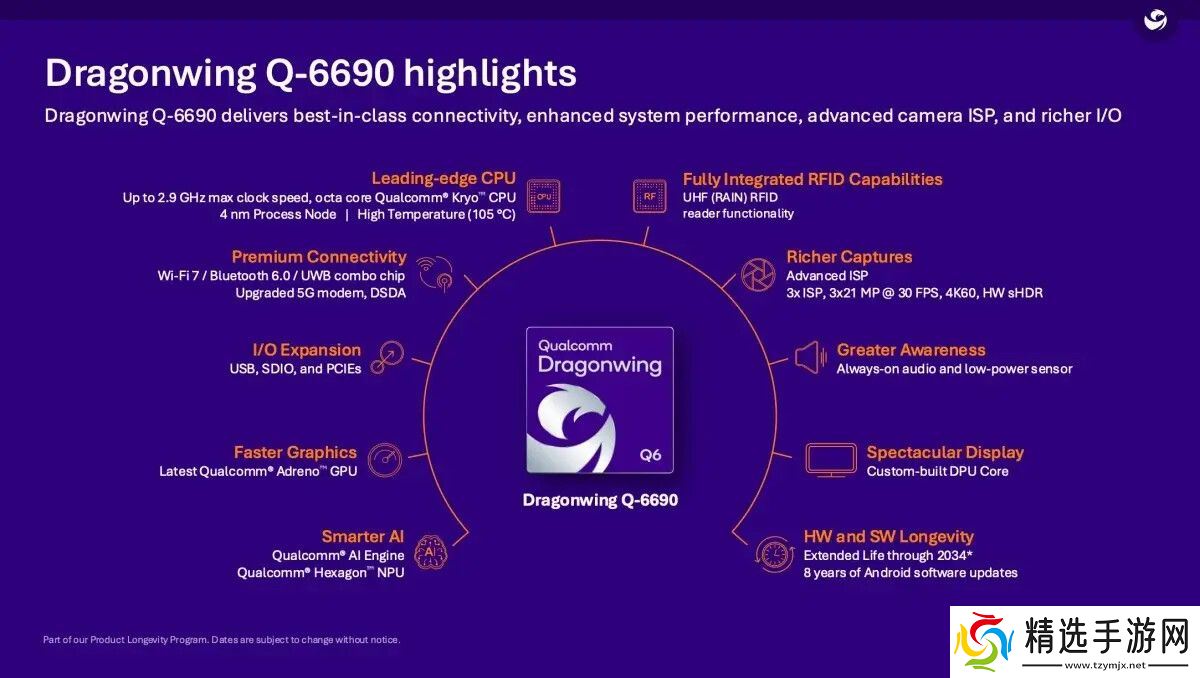 高通跃龙 Q-6690 芯片内置 5G、Wi-Fi 7、蓝牙 6.0 和超宽带通信模块,可实现接近感知交互及稳定高速的全球连接。该芯片设计无需外接 RFID 模块,让设备体积更小、功耗更低,并适用于零售、物流、工业等多种应用场景。