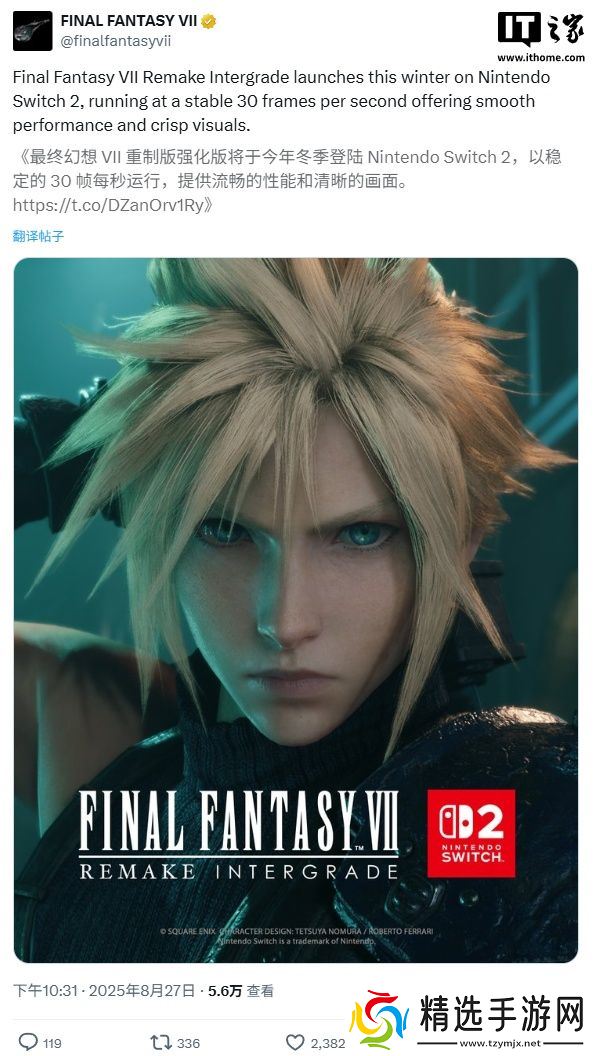 本站 8 月 27 日消息,史克威尔艾尼克斯(Square Enix)刚刚宣布,《最终幻想 7 重制强化版》将于 2025 年冬天登陆任天堂 Switch 2 平台。这是该系列重制三部曲的首部作品,预计未来还会有更多作品移植到该平台。