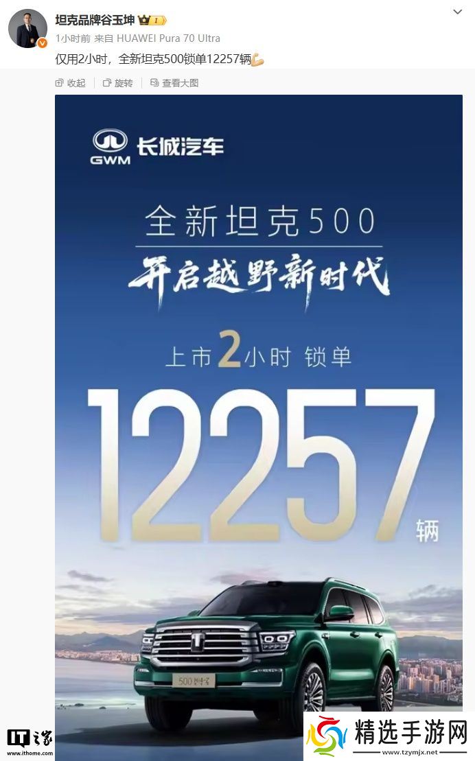 本站注意到,长城汽车股份有限公司 TANK 品牌执行副总经理谷玉坤发文称:“仅用 2 小时,全新坦克 500 锁单 12257 辆”。