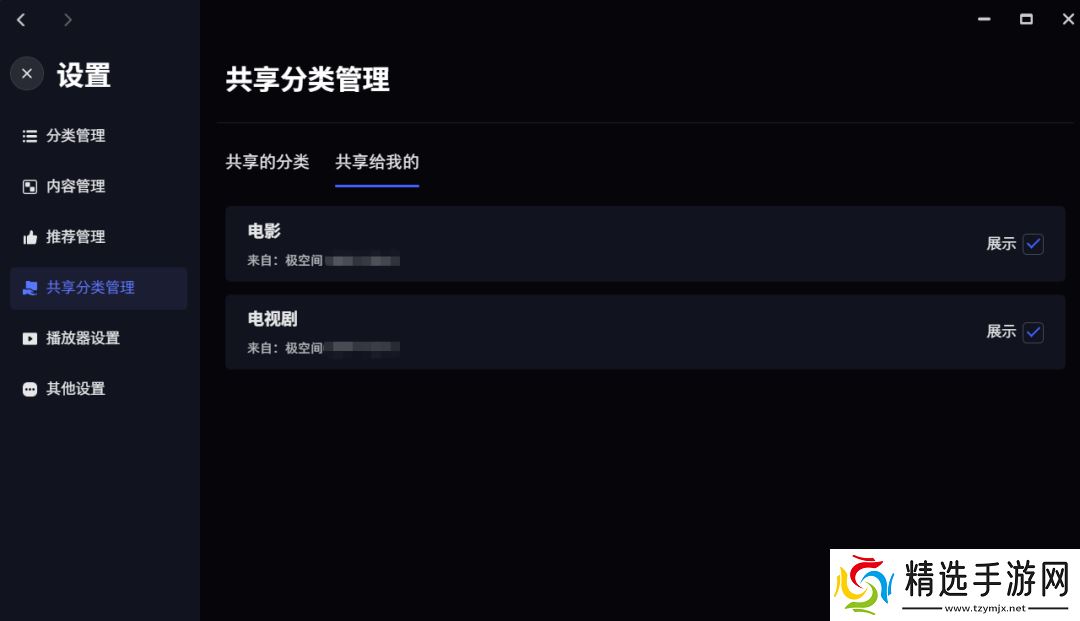 极影视现加入“共享给我”的分类,可以将指定影视库设为共享分类,使得在相同设备登录不同账号时也能看到,并支持设置指定账号可见,别人共享给我之后,我可以自己再管理这些分类,不喜欢别人共享给我的分类的时候,则可以不展示。