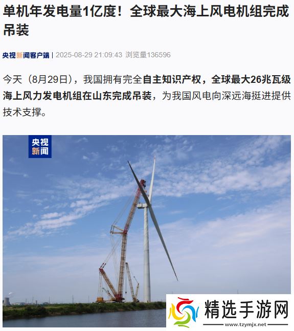 本站 8 月 29 日消息,据央视新闻报道,今天,我国拥有完全自主知识产权,全球最大 26 兆瓦级海上风力发电机组在山东完成吊装,为我国风电向深远海挺进提供技术支撑。