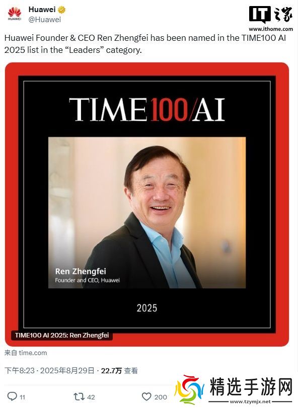 本站 8 月 29 日消息,华为创始人、董事、CEO 任正非入选《时代》周刊 2025 年度“全球 AI 领域百大影响力人物”(TIME100 AI)榜单,归类于“领导者”类别。