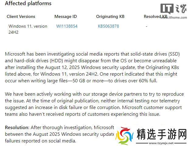 微软对此表示:经调查,并未发现 2025 年 8 月 Windows 11 安全更新与用户反馈的固态硬盘(SSD)及机械硬盘(HDD)故障或数据损坏之间存在关联。