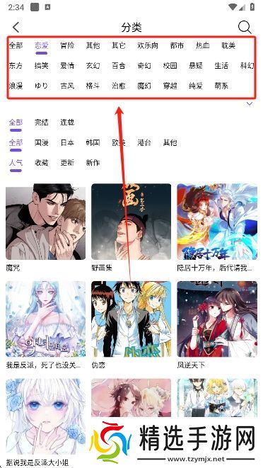 3、选择感兴趣的类别后会获得大量的漫画。