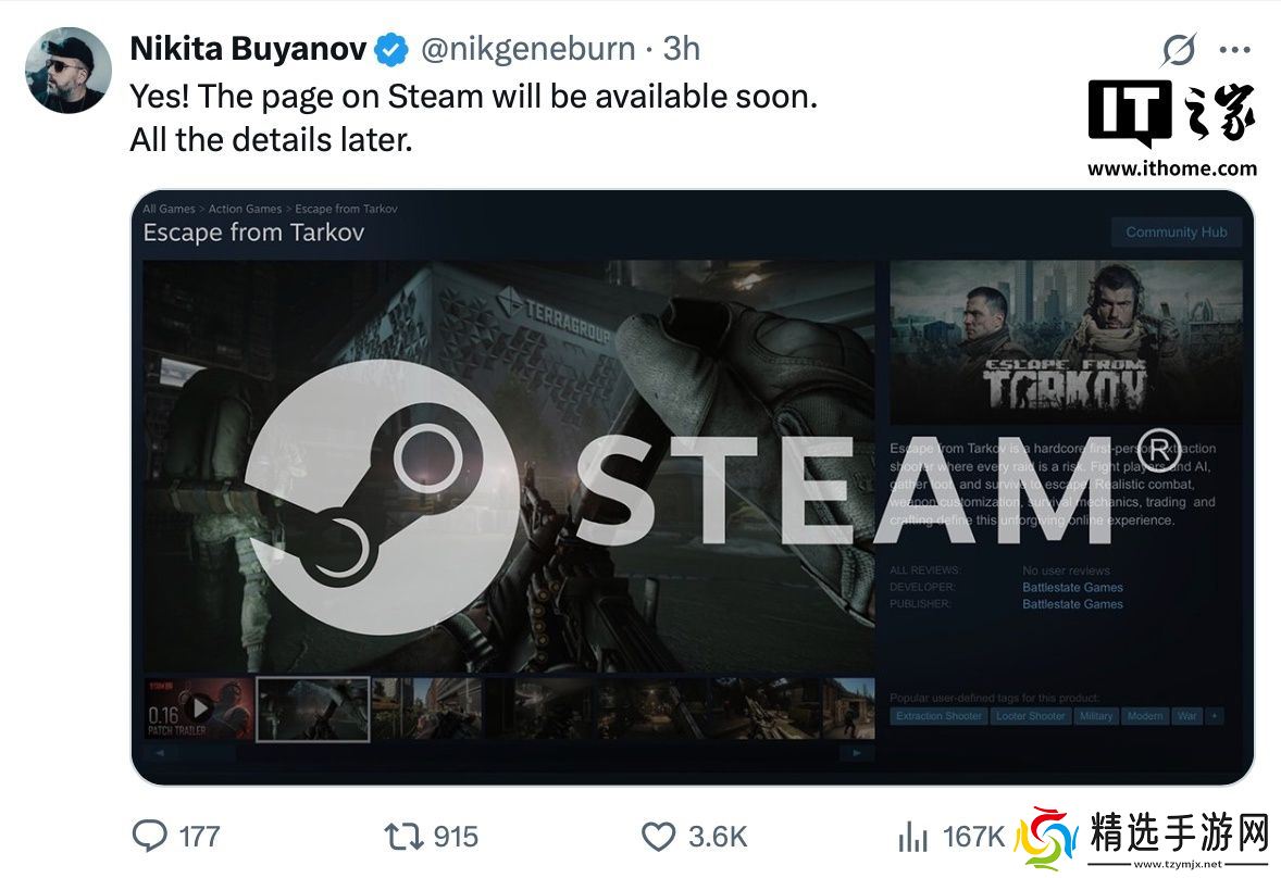 本站 8 月 31 日消息,开发商 Battlestate Games 负责人 Nikita Buyanov 在 X 平台发文,确认《逃离塔科夫》将登陆 Steam 平台,并放出了一张 Steam《逃离塔科夫》页面的示意图。