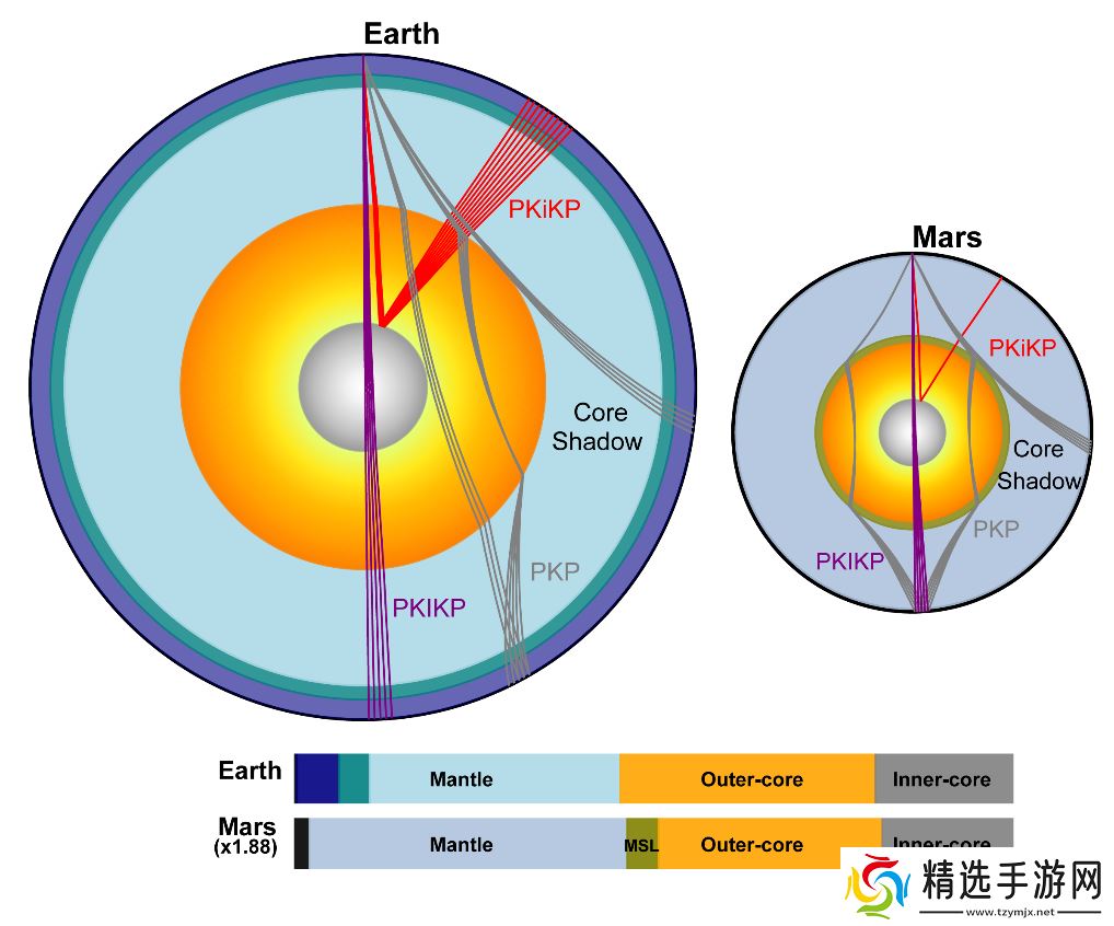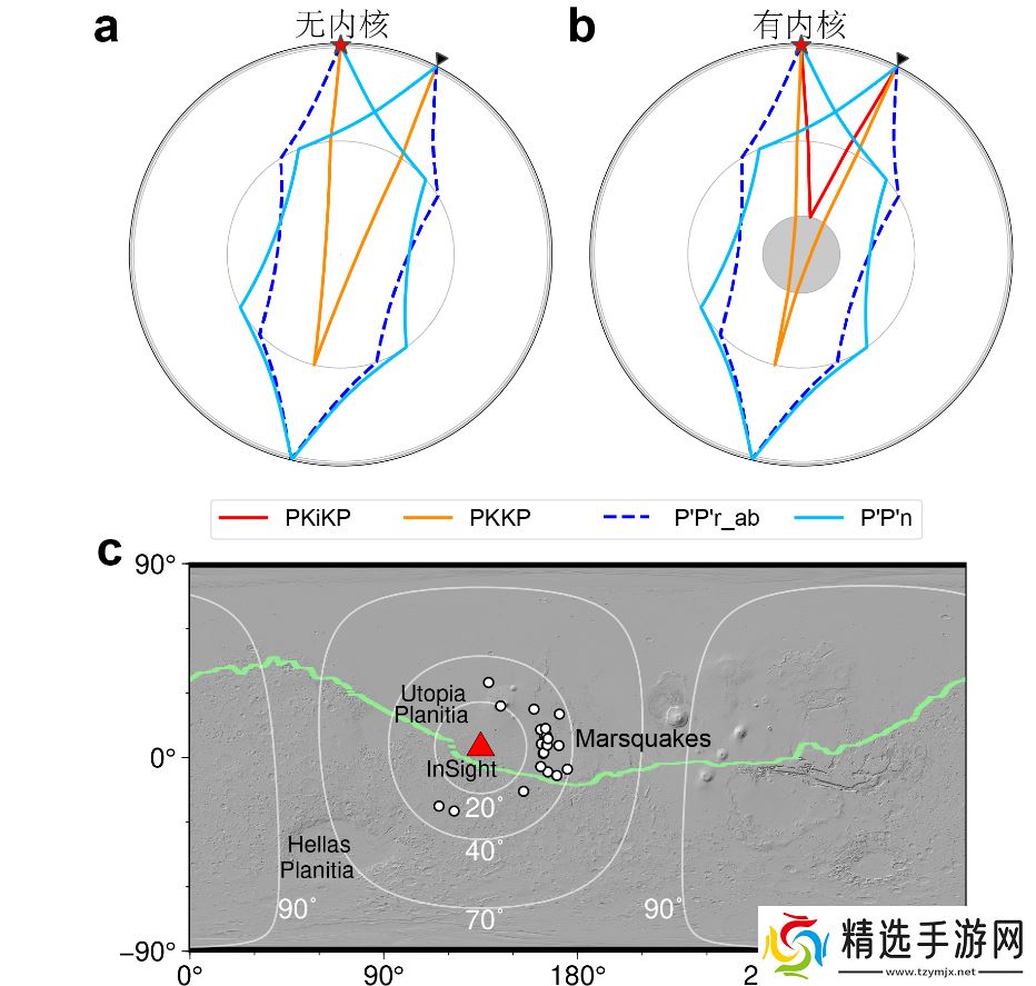 特别值得注意的是,实际观测到的 PKKP 到时,较当前仅考虑液态核的火星速度模型所预测的结果提前了 50 至 200 秒。地震波在固体中的传播速度比在液体中快。因此,这一差异表明,火星核具有分层结构:即外层为液态核,而更深部则存在一个波速更高的固态内核。