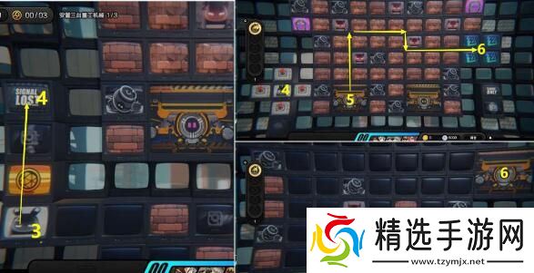 (3)接着去4区域,4区域上下左右4个控制机关,可以控制5机械移动,将5机械按照下图路线,移动到6区域即可