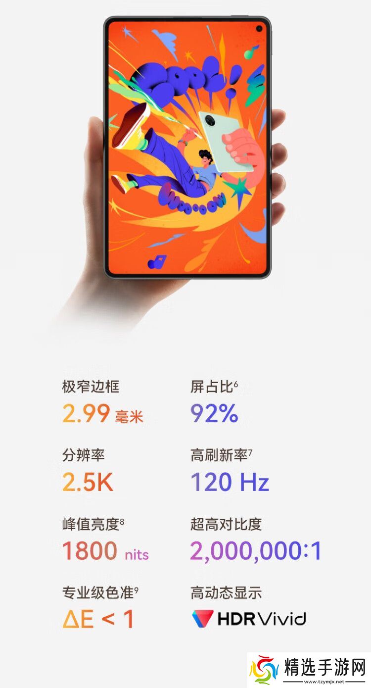 该平板搭载 8.8 英寸 2560*1600p 16:10 OLED 屏,采用 2.99mm 四等边 + 挖孔屏设计,92% 屏占比,支持 120Hz 高刷、1800 尼特 HDR 动态显示,Real RGB 像素密度达到了 343PPI,相比 iPad mini 机身更小、视野更大。