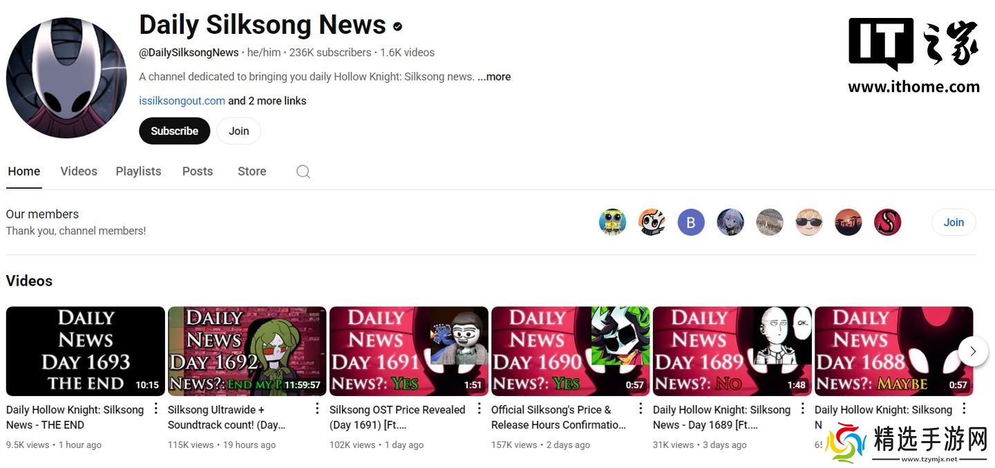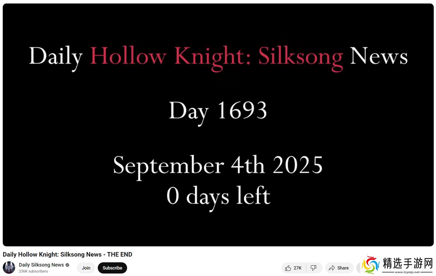 对《空洞骑士:丝之歌》感兴趣的玩家都知道,在过去几年里的大多数日子,根本没有多少丝之歌相关新闻。因此,该频道的大部分视频时长都不到一分钟,封面则是包含一个展示主角的缩略图,以及文字“每日新闻第 XXXX 天,有消息吗?:无”。