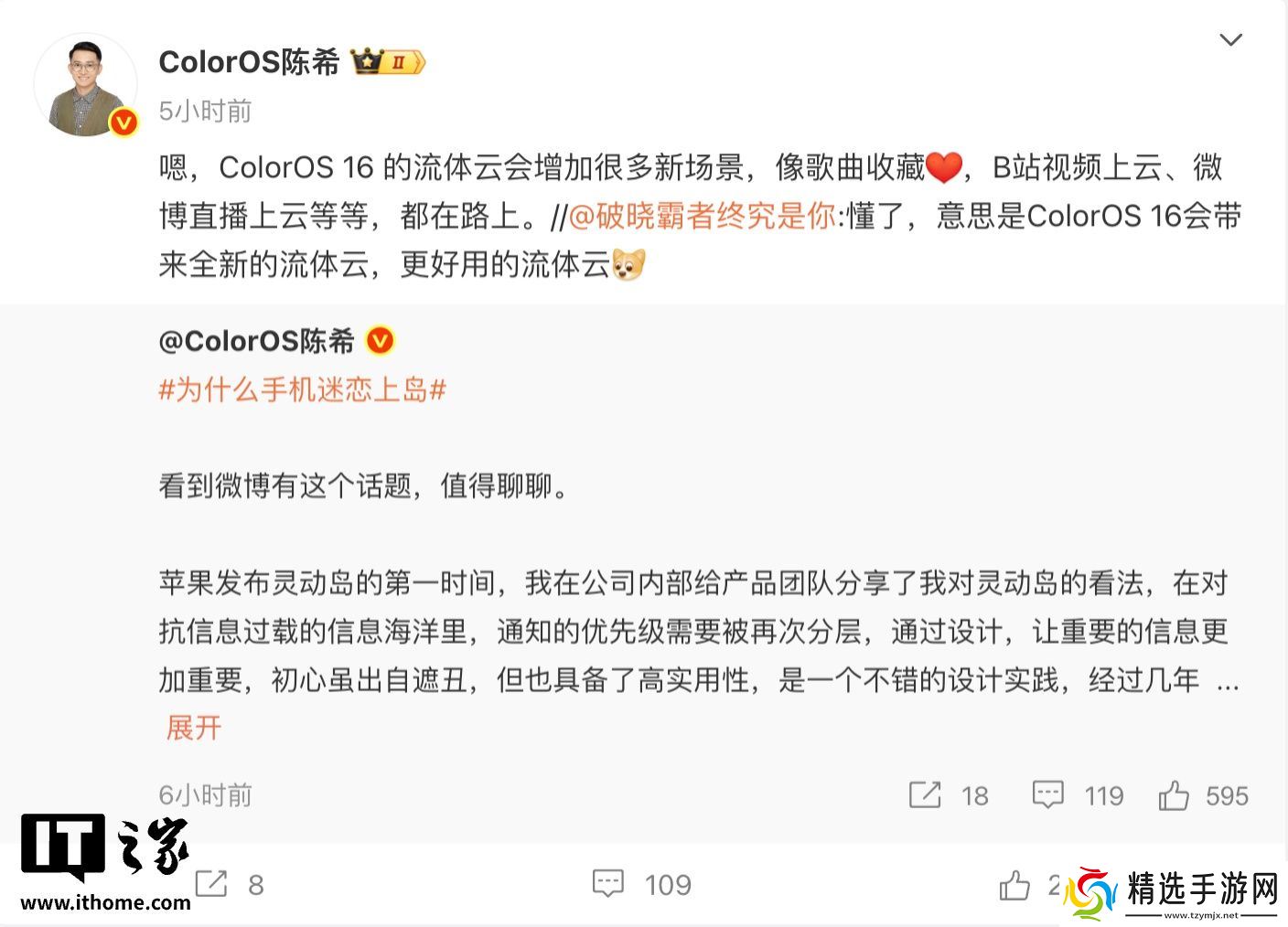 陈希后续又发文披露,ColorOS 的流体云将增加很多新场景,如歌曲收藏、B站视频上云、微博直播上云等“都在路上”。