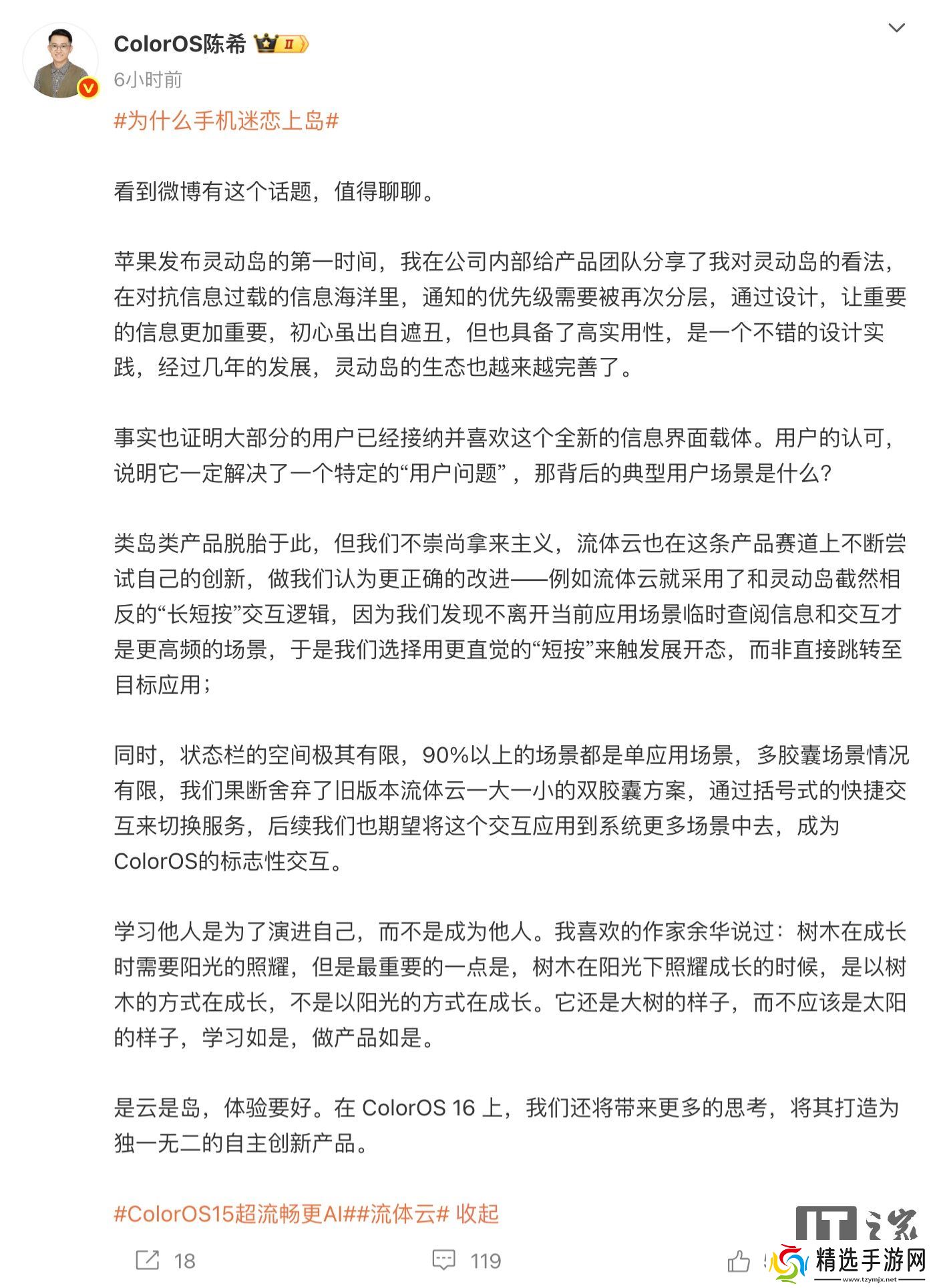 本站 9 月 4 日消息,OPPO ColorOS 设计总监陈希今天下午在微博发文谈“为什么手机迷恋上岛”,其表示,看到微博有这个话题,值得聊聊。