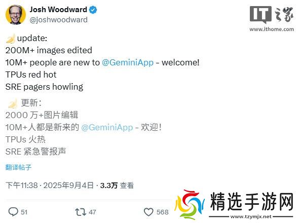 昨晚,谷歌实验室副总裁 Josh Woodward 在 X 上透露,自该功能上线以来,累计已完成超 2 亿次图像编辑,带动超 1000 万新用户尝试 Gemini 应用。对于这款产品的受欢迎程度,他形容称内部“TPU 严重过载,SRE 警报不停。”