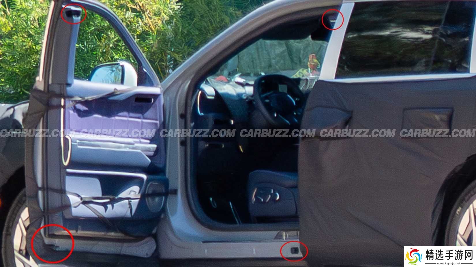 最新的谍照表明,为了让后车门向后开启,捷尼赛思重新设计了锁扣系统。常规 SUV 的车门在中间会有锁点,而 GV90 则将其分为上下两个位置:车门上角的接口对应车柱,下方的挂钩与黑色矩形部件契合。