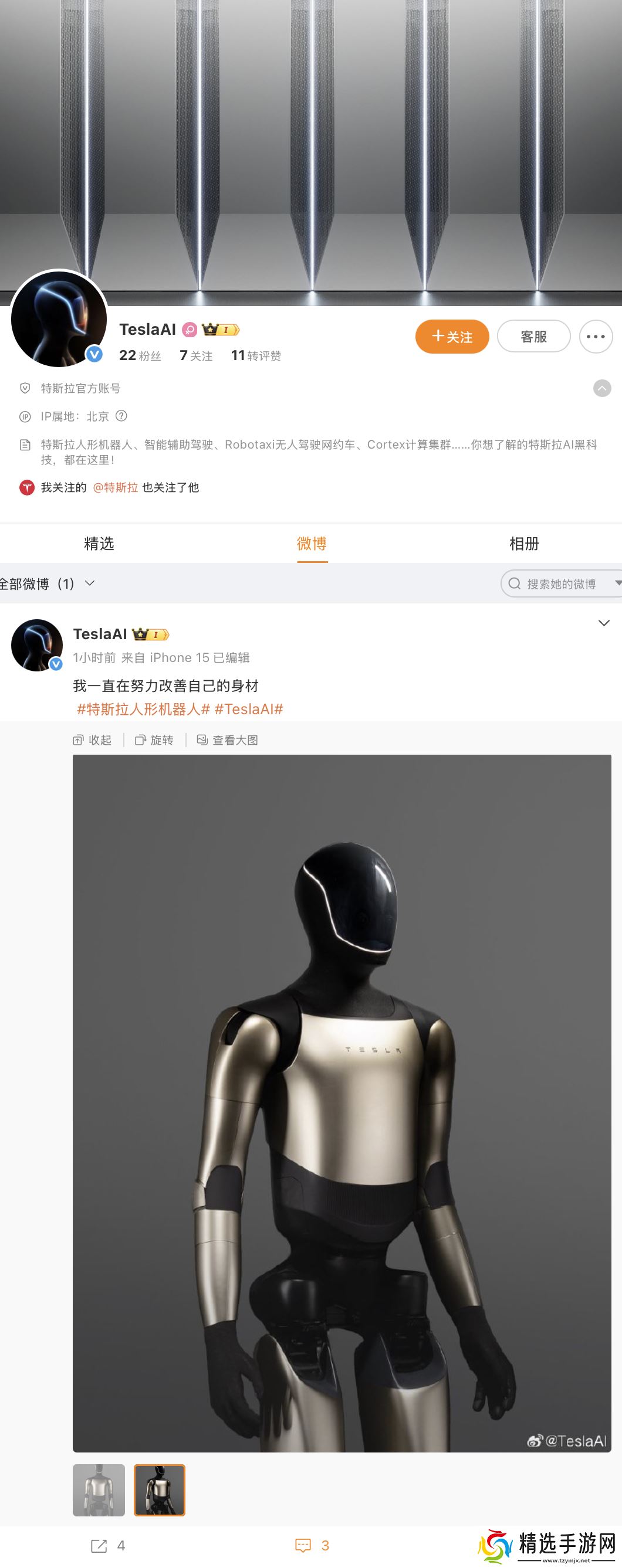 目前,其已发布首条微博,主要展示了特斯拉人形机器人的外观,参考图片,该机器人身上印有特斯拉 Logo,整体采用浅金色 / 黑色配色,应当是先前曝光的“Optimus 3 人形机器人”。