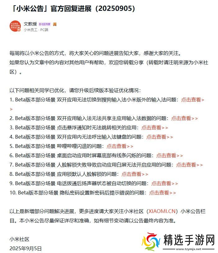 本站 9 月 7 日消息,小米员工本周继续在小米社区更新澎湃 OS 3 Beta 版的优化进展,其中提到双开应用无法切换到搜狗输入法小米版外的输入法、人脸解锁失败导致启动应用白屏无法开启应用等问题已优化,并表示用户升级后续版本后可验证优化情况。