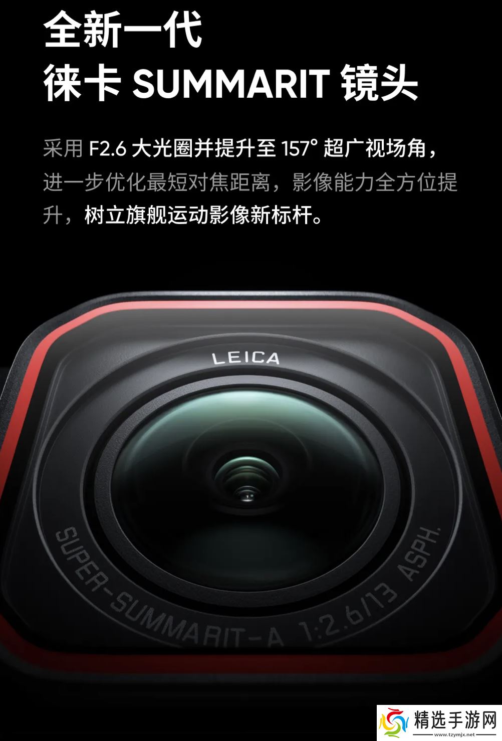 据介绍,该机搭载徕卡与影石合作的 Super-Summarit-A 1:2.6/13 Asph. 镜头,拥有 F2.6 光圈,视场角 157 度;同时配备 1/1.3 英寸 8K 传感器,动态范围 13.5 档,至高支持拍摄 8K30FPS 视频,也可以拍摄 4K60FPS 运动 HDR 视频 / 夜景视频或 4K120FPS 慢动作视频。
