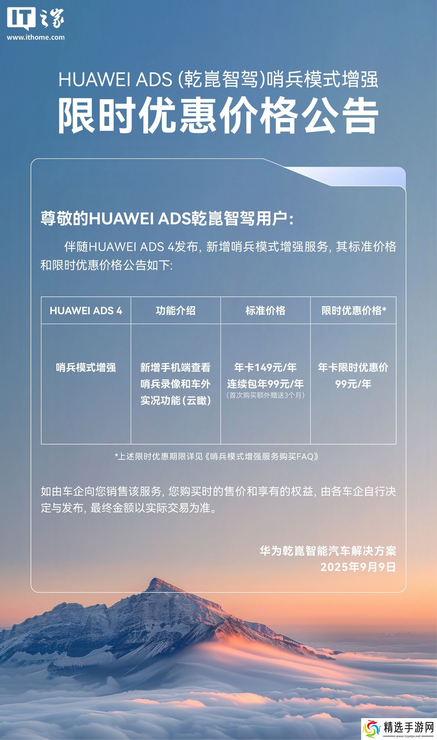 本站 9 月 10 日消息,华为乾崑智能汽车解决方案昨日官宣推出 HUAWEI ADS(乾崑智驾)哨兵模式增强版,新增手机查看哨兵录像、车外实况功能(云瞰)功能。新版本哨兵模式可按需购买,连续包年 99 元 / 年。