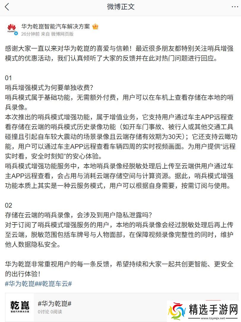 本站注意到,华为智能汽车解决方案 BU 官方微博今日发文回应了用户所关注的热门问题,其中包括哨兵增强模式为何要单独收费、存储在云端的哨兵录像是否会涉及到用户隐私泄露。原文如下: