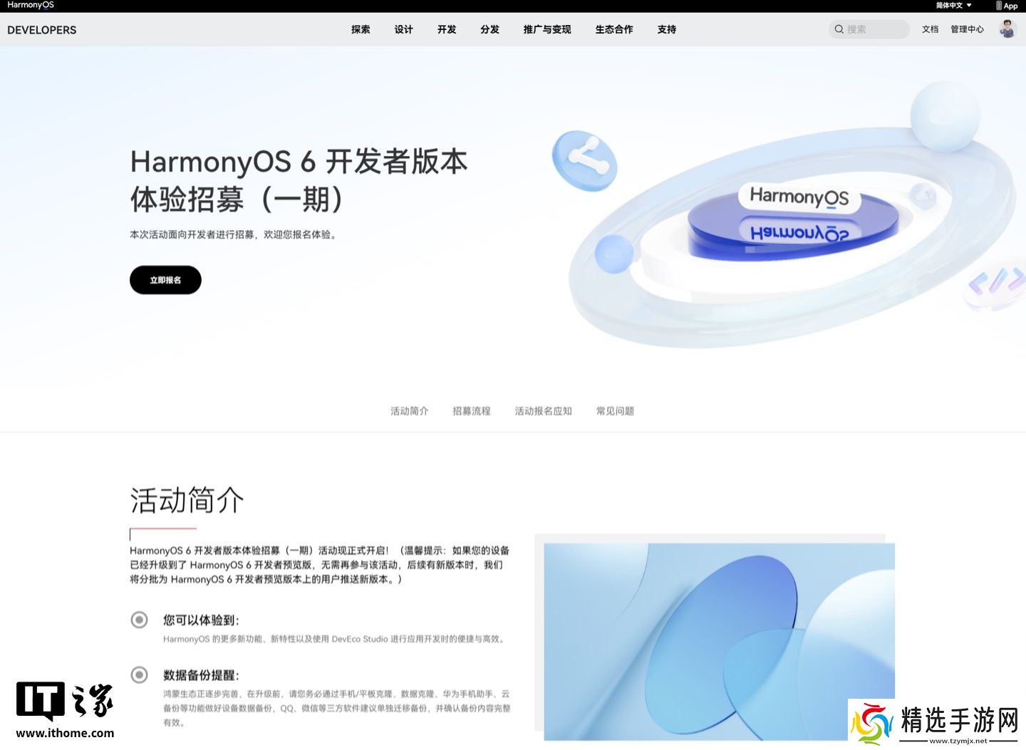 本站 9 月 10 日消息,华为开发者官网显示,鸿蒙 HarmonyOS 6 开发者版本体验招募(一期)活动现正式开启(如果设备已经升级到了 HarmonyOS 6 开发者预览版,无需再参与该活动,后续有新版本时,将分批为 HarmonyOS 6 开发者预览版本上的用户推送新版本)。