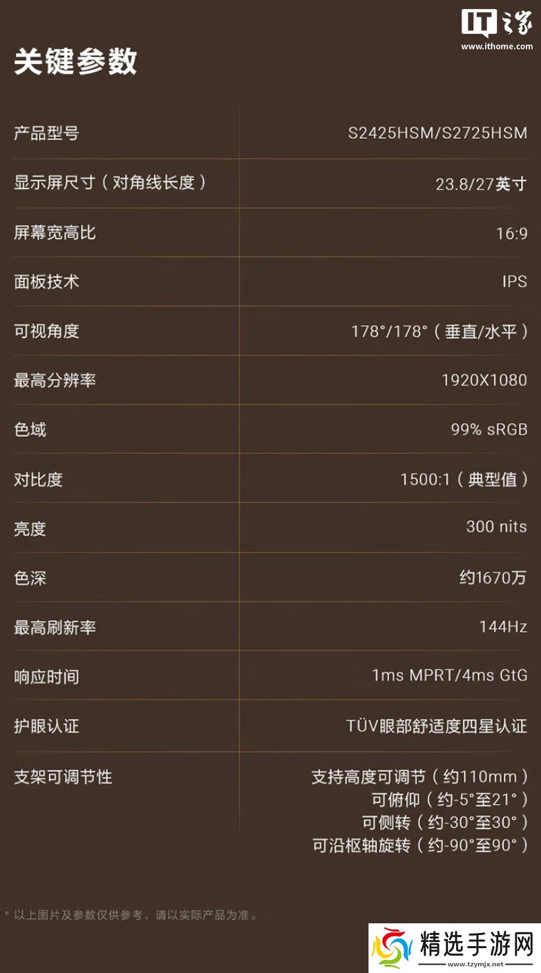 系列机型均配备 1920x1080 分辨率 144Hz IPS LCD 面板,显示器亮度 300 尼特,静态对比度 1500:1,GtG 响应速度 4ms,覆盖 99% sRGB 色域。