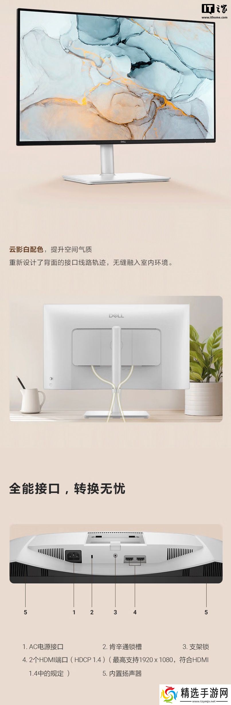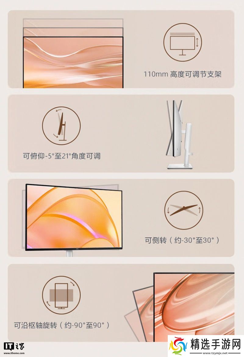 系列机型支架支持升降 / 倾斜 / 旋转,显示器本体配备双 3W 扬声器,提供 2 个 HDMI 接口、1 个 3.5mm 音频接口。