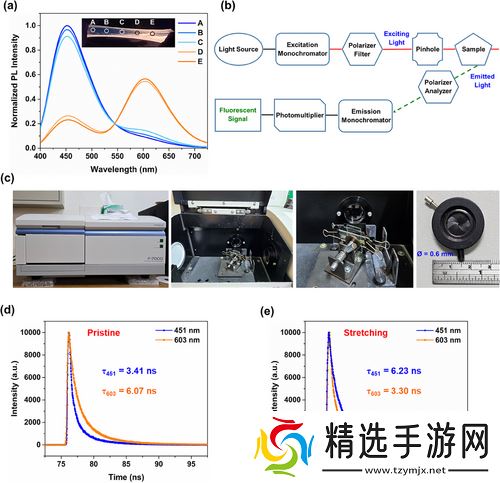 在此基础上,研究团队还在这些分子上连接了一种名为 DPAC 的特殊荧光单元。当 DPAC 可自由移动时,会发出橙色荧光;而当它的运动受到限制(如材料被拉伸或弯曲时),则会发出蓝色荧光。