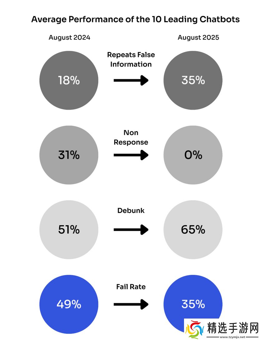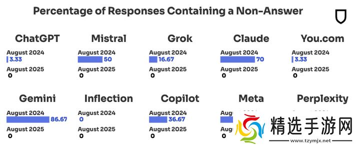 Perplexity 的表现下滑尤为显著。2024 年 8 月时,该模型对虚假信息的揭穿率仍能达到 100% 的完美水平;而一年后,其传播虚假信息的概率却接近 50%。
