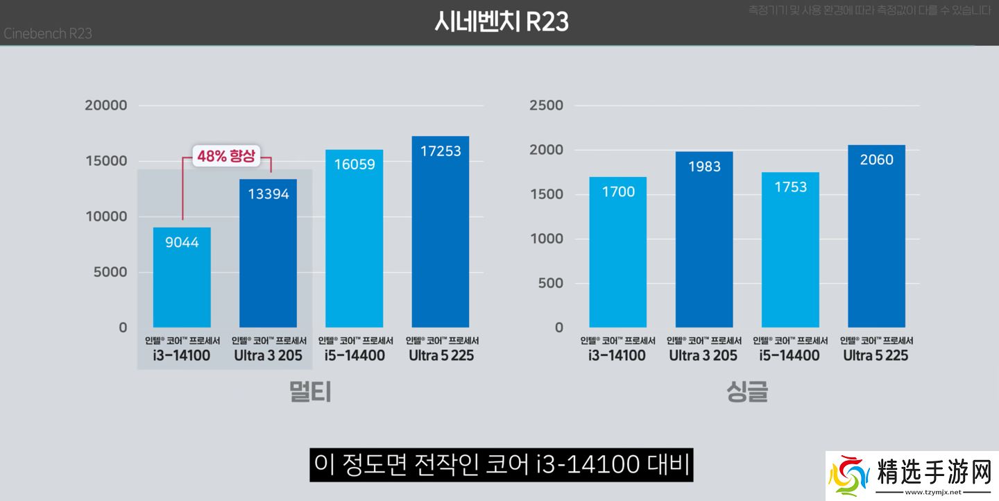 在 Cinebench R23 测试中,Ultra 3 205 多核得分 13,394 分,比 i3-14100 高了大约 48%;单核得分 1,983 分,超越了 i3-14100 和 i5-14400。