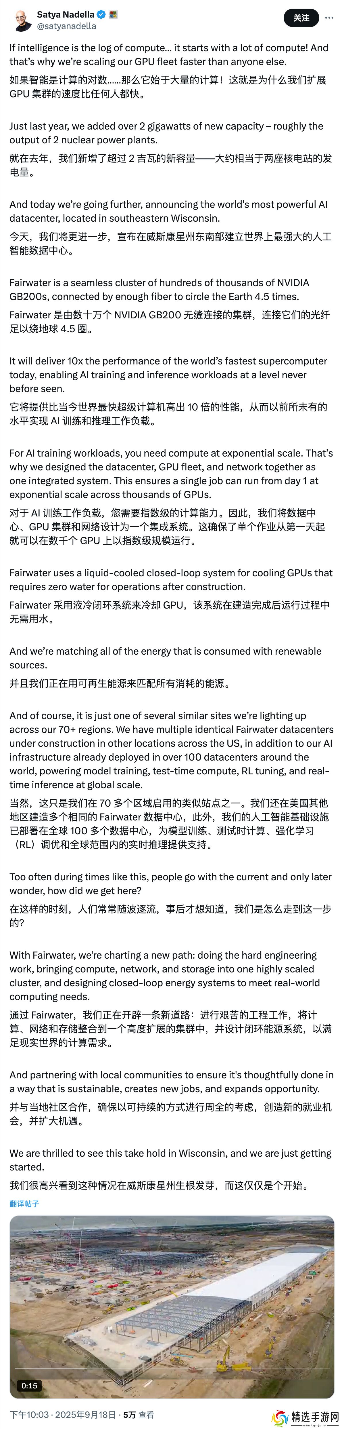 微软 CEO 萨蒂亚・纳德拉在 X 上自信喊话:“这个数据中心将是世界最强大的 AI 数据中心,性能是当今世界最快超级计算机的 10 倍,可支持前所未有的 AI 训练和推理工作负载。”他表示,微软将数据中心、GPU 集群和网络设计为一个集成系统。确保单个作业从第一天起就可以在数千个 GPU 上以指数级规模运行。