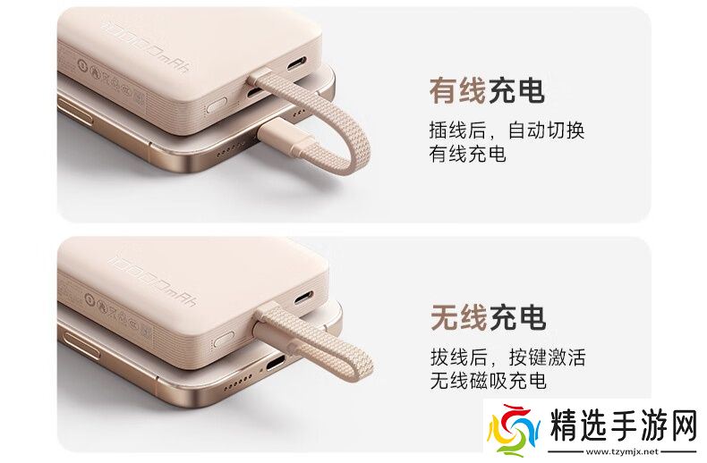这款自带线充电宝电池容量 10000mAh,自带编织线;插线后自动切换有线充电,拔线后按键激活无线磁吸充电。