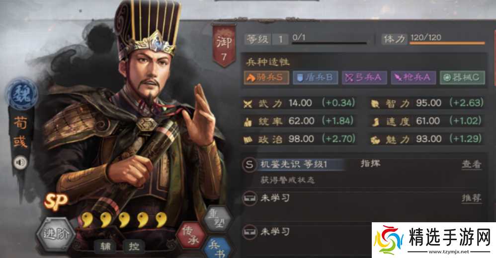 荀彧分为普通版本和SP版,两者的定位和兵种选择完全不同。普通荀彧的兵种适性普遍偏低,骑兵、盾兵、枪兵都是C级,弓兵B级,器械也是C级,这样的属性使得他无法在战场上发挥太大作用。因此普通荀彧更适合担任内政官角色,可以放在主政官、采石官或税务官的位置上。利用其**属性提升资源产量和铜币收益,强行让他上阵战斗只会浪费宝贵的武将位置。