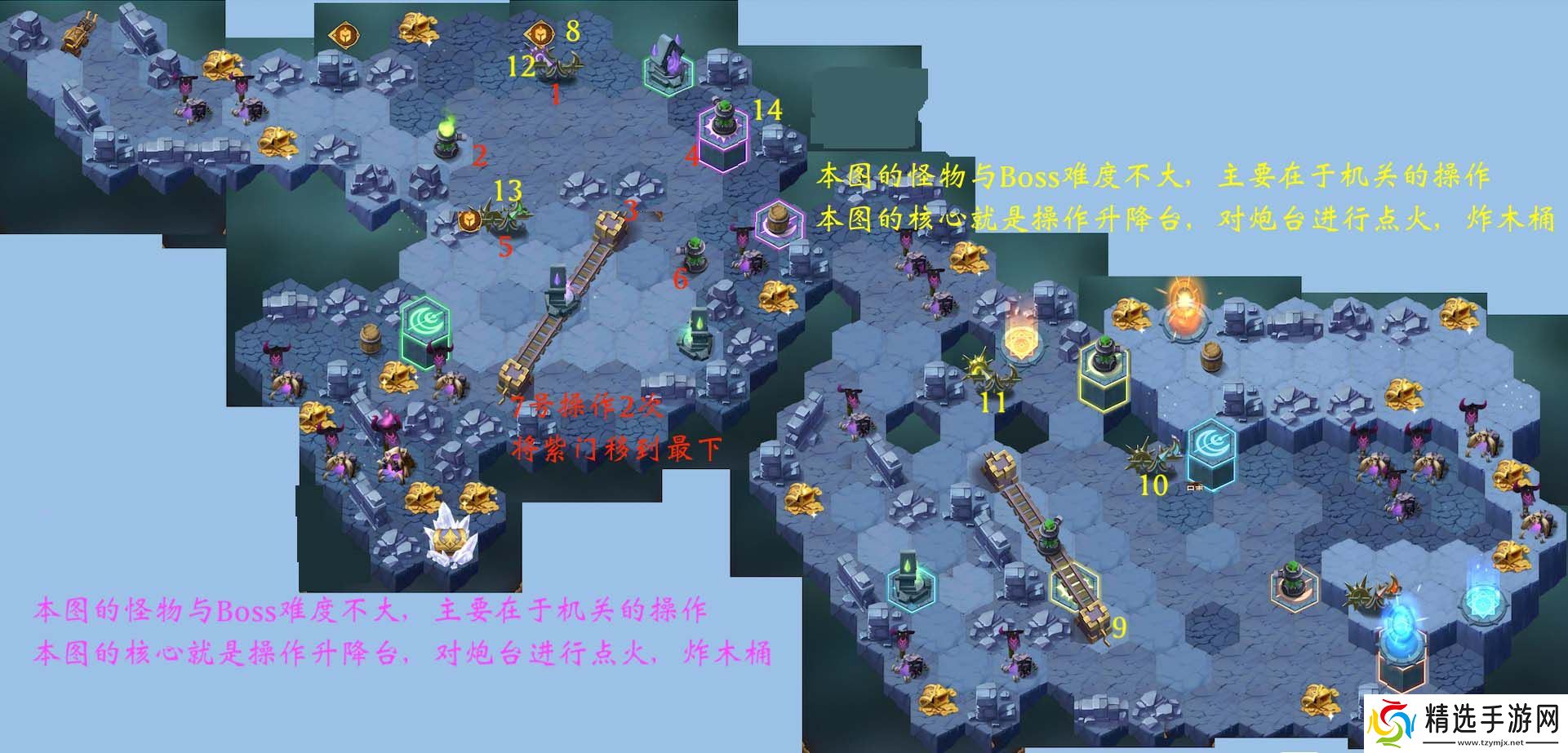 这次宝箱中是没有自选英雄的,要注意炮台的点燃顺序。点燃开局时自己位置旁的火盆,用冰元素铺路,绕一圈来到地图左下角。地图左下角有两个炮台,先不要点右边的,这个炮台指向的是右边终点,要最后再来。先点靠左边那个指向右上的炮台。然后从右边绕到右上方的火盆,点燃后继续让冰元素铺路,这个火盆等下还会用到。冰元素铺路会经过左下角一个宝箱,拿了宝箱后再左下角点燃火盆。具体的操作顺序如图即可