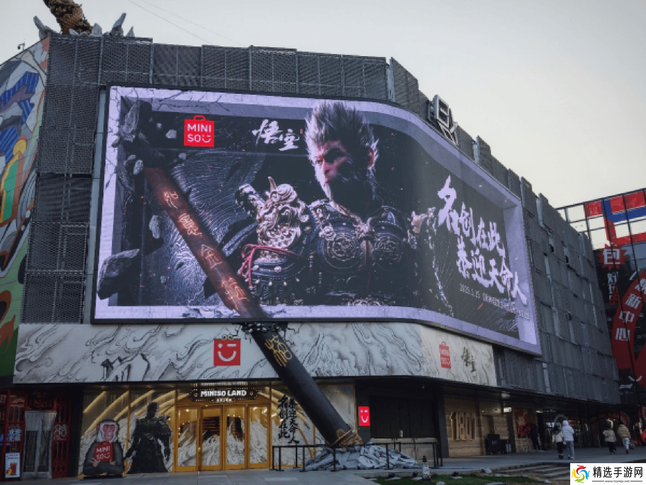 在2025年新春佳节前夕,北京名创优品1号店外,一幅震撼人心的巨幕广告吸引了无数行人与粉丝的目光。这幅广告来自备受瞩目的游戏《黑神话:悟空》,其主角天命人身披战甲,手持如意金箍棒,仿佛跨越了次元界限,将游戏世界与现实紧密相连。