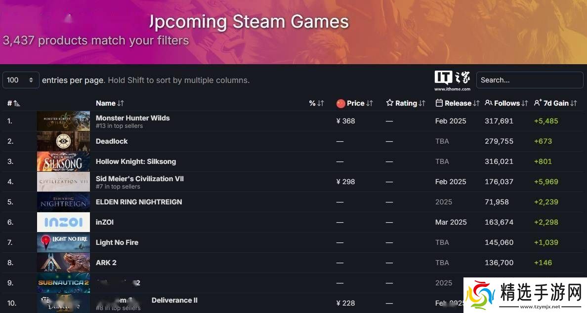 根据 SteamDB 的数据,这款游戏的关注度在过去一年中稳步攀升,逐渐超越了许多其他热门游戏和系列作品。注意到,这款游戏目前已经超越《Deadlock》及《空洞骑士:丝之歌》成为 Steam 上最受期待的游戏(加入愿望单最多的待发售作品)。