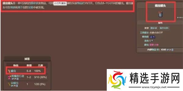 蠕虫罐头是一种可以消耗的摸彩袋类物品,通常可以在地表或地下的宝箱中找到。玩家可以开启这些罐头,约有5%的几率会掉落金蠕虫。