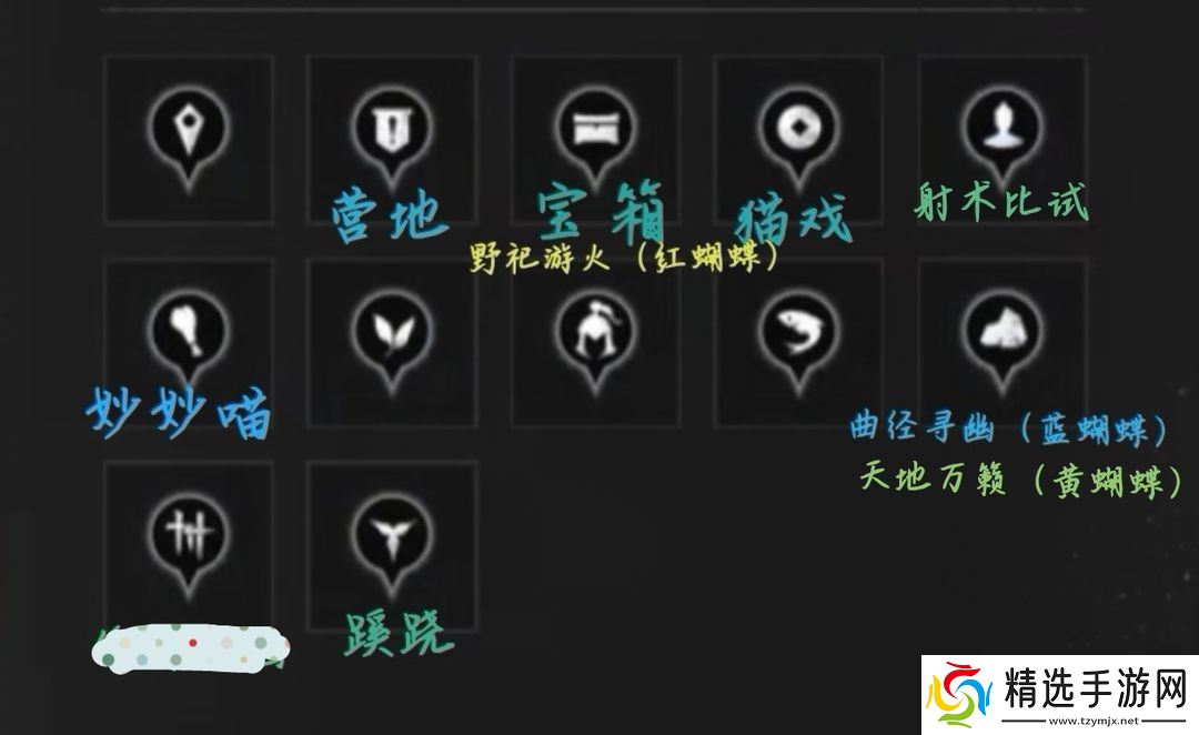 蹊跷、妙妙喵、猫戏、营地、天地万籁、野祀游火、以武会友、悬壶治疗、话术论道、丝竹雅韵、投壶雅戏、射术比试