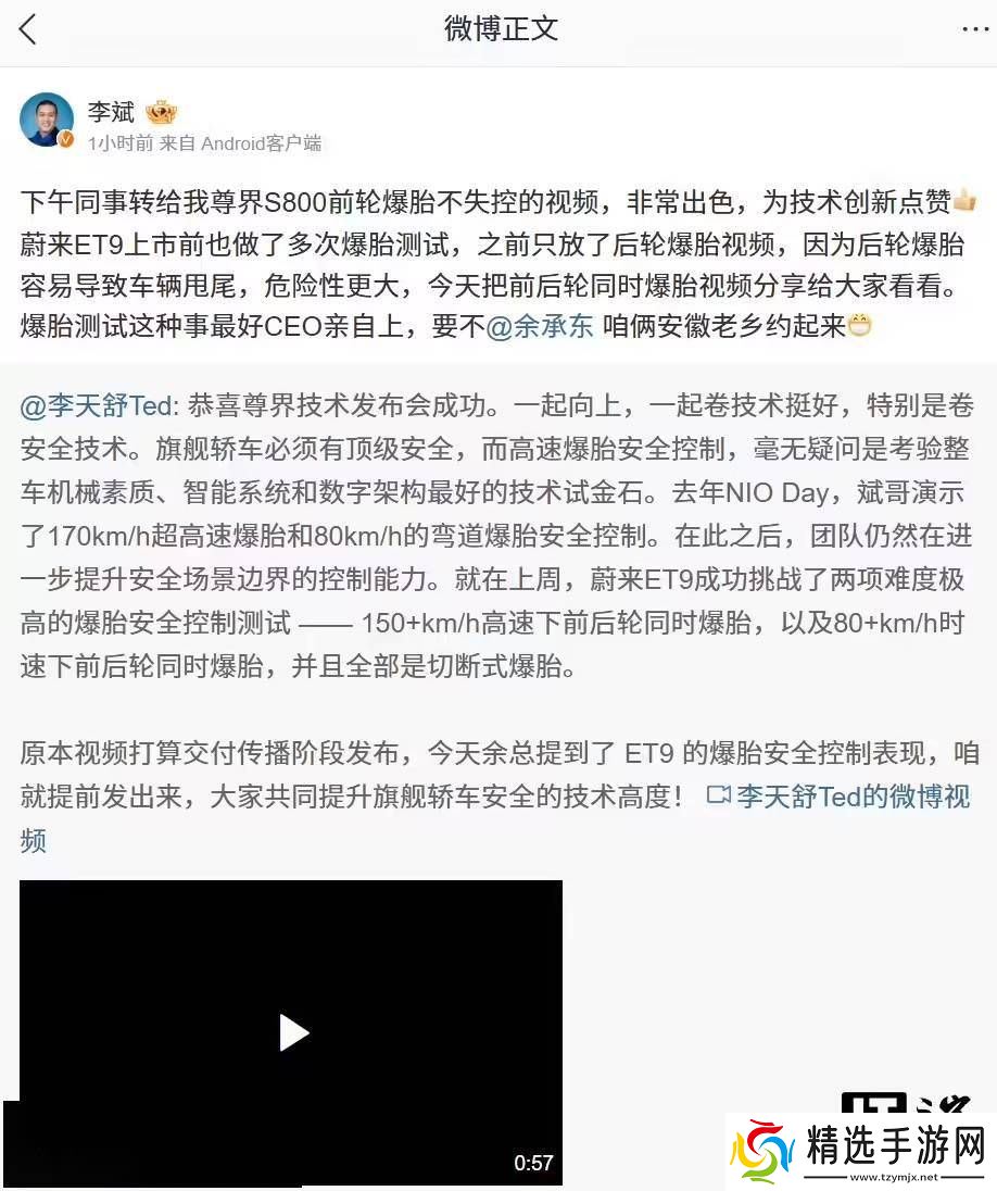 此番互动的前因,是蔚来汽车方面的一次技术展示。蔚来产品副总裁李天舒通过社交媒体分享了ET9轿车在高速直线行驶中成功应对前后轮爆胎的测试视频。蔚来创始人李斌随后转发了该视频,并幽默地表示,这类爆胎测试最好由CEO亲自上阵,同时他还向余承东发出了共同测试的挑战。