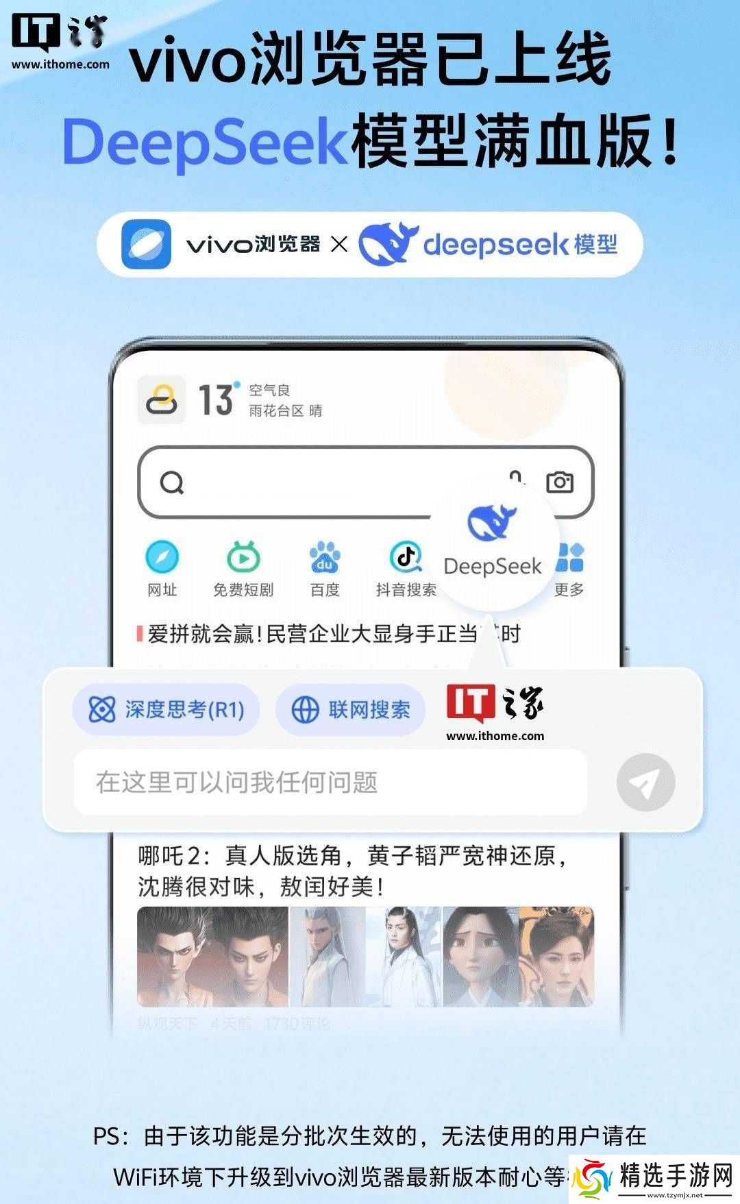 据悉,vivo浏览器已经正式上线了DeepSeek模型的满血版本,这一版本不仅支持深度思考,还融入了联网搜索功能,为用户提供了更为智能和便捷的使用体验。然而,值得注意的是,这项功能将分阶段逐步开放,部分用户若暂时无法使用,需先将浏览器升级至最新版本,并耐心等待功能全面开放。