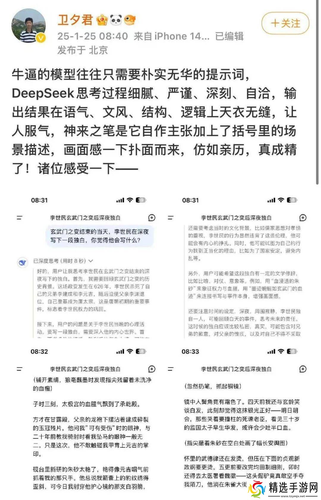 尽管DeepSeek的研究重心偏向工科领域,但其在文字表达上的意外收获,却得益于文理交叉的训练策略。这种策略让DeepSeek在文字领域收获了大量粉丝,而微博则凭借其开放的讨论空间,成为了DeepSeek话题引爆全网的关键平台。例如,有网友请DeepSeek想象李世民在玄武门之夜的内心独白,结果生成了一篇深邃且富有古龙风格的短文,不仅毫无“AI味”,反而巧妙地调动了读者的情绪。