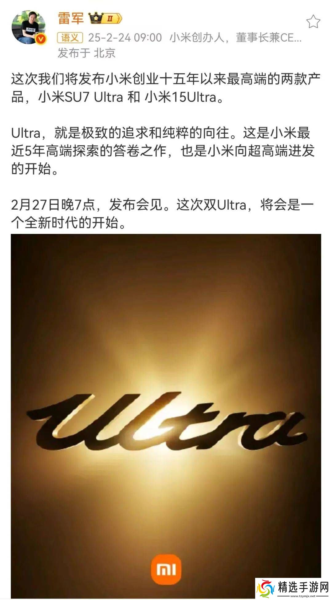 雷军在社交媒体上正式宣布,小米将于2月27日晚7点举办新品发布会,届时将揭开小米15 Ultra与小米SU7 Ultra的神秘面纱。这两款产品被雷军誉为小米创立十五年以来最为高端的杰作。