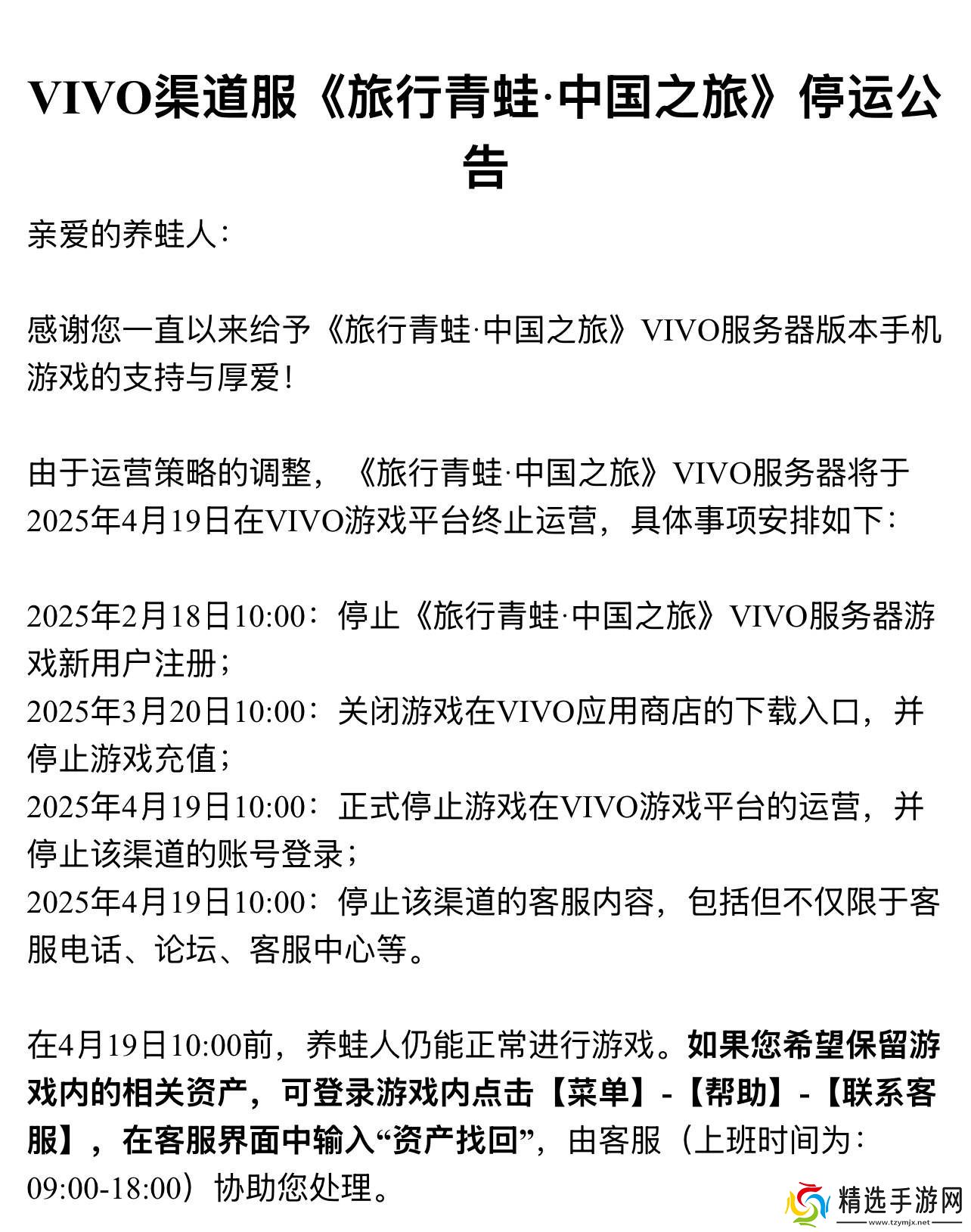 知名游戏《旅行青蛙·中国之旅》近日传出关服消息,引起了广泛玩家的关注。据三言科技获得的最新资讯,该游戏在其官方网站上正式宣布将停止VIVO渠道服的运营。