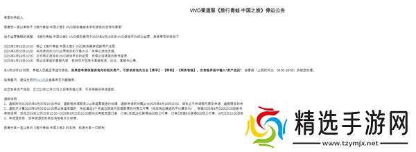 根据官方公告,受运营策略调整的影响,《旅行青蛙·中国之旅》在VIVO平台的服务器将于4月19日正式终止运营。这一决定意味着,VIVO服务器的玩家将不得不面对与这款游戏的告别。
