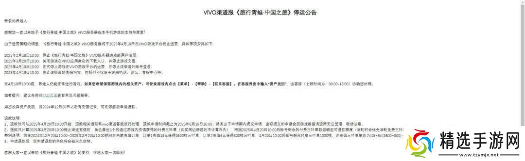 近期,一款曾风靡一时的游戏《旅行青蛙·中国之旅》在其官方网站上发布了一则令人唏嘘的公告,宣布VIVO服务器将于4月19日正式停止运营。这一消息迅速在游戏玩家群体中引发了热议,不少网友回忆起当年这款游戏的辉煌岁月,感叹即便是曾经热度直逼《王者荣耀》的《旅行青蛙》,也难以逃脱玩家流失、逐渐沉寂的命运。
