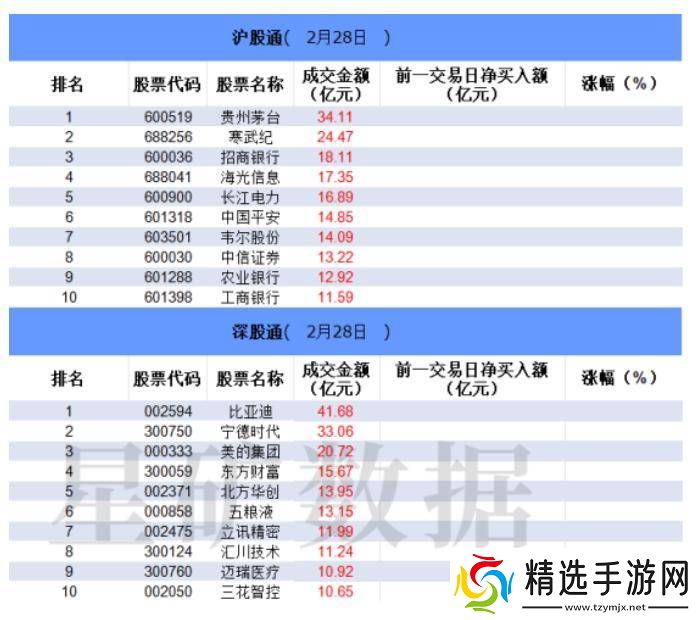 沪深股通今日(2月28日)合计成交2691.97亿,其中贵州茅台和比亚迪分居沪股通和深股通个股成交额首位。板块主力资金方面,食品饮料板块主力资金净流入居首。ETF成交方面,标普500ETF基金(513650)成交额环比增长256%位居首位。期指持仓方面,IC期指多头加仓空头减仓。龙虎榜方面,圣阳股份获机构买入1.55亿;;华丰科技遭机构卖出1.51亿;共进股份遭一家机构卖出2.7亿;大位科技获两家一线游资席位合计买入2亿;恒为科技获银河证券大连黄河路营业部买入1.19亿;中百集团遭国泰君安宜昌沿江大道营业部卖出1.63亿;卓翼科技遭一家量化席位大幅做T。