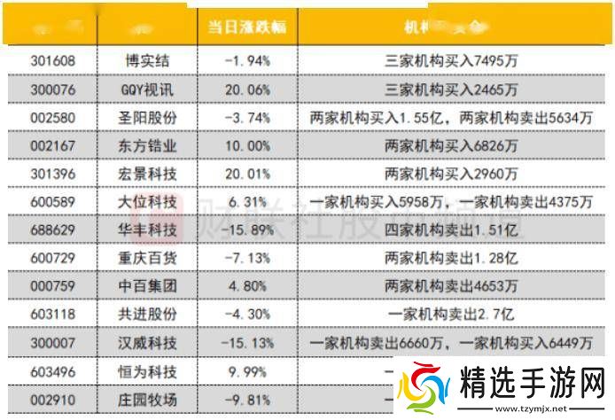 今日龙虎榜机构活跃度明显下降,买入方面,博实结获机构买入超7000万,该股连续两日获机构买入;圣阳股份获机构买入1.55亿;固态电池概念股东方锆业获机构买入超6000万。